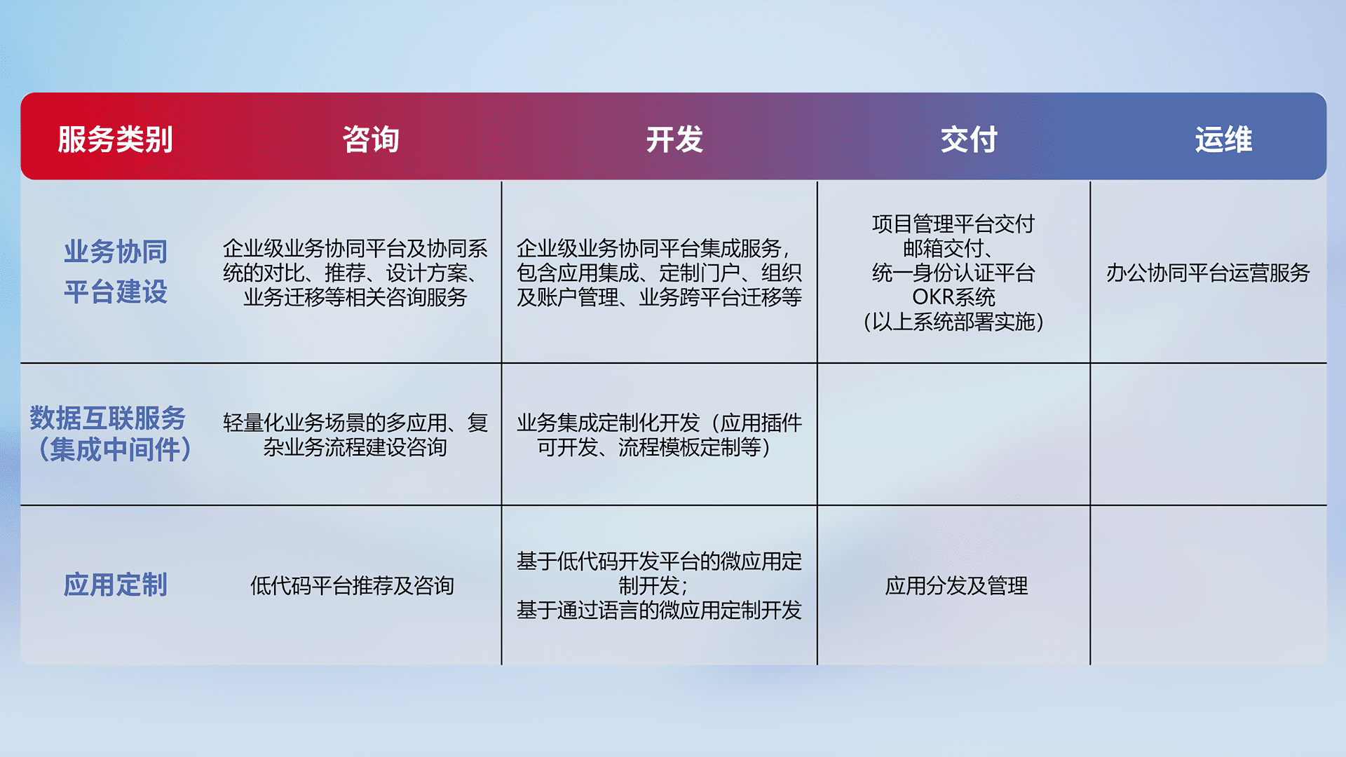 针对钉钉、、企微、、、、IDaas等平台级产品提供产品的规划、、、方案、、、交付、、、定制化开发等服务,,实现如统一协同办公、、智能客户服务、、混合会议管理、、、、智能数据查询、、、、等业务场景,,,,实现数字化转型。。。